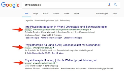 Google Suchergebnis für den Suchbegriff “Physiotherapie” – Anzeige von drei AdWords Textanzeigen